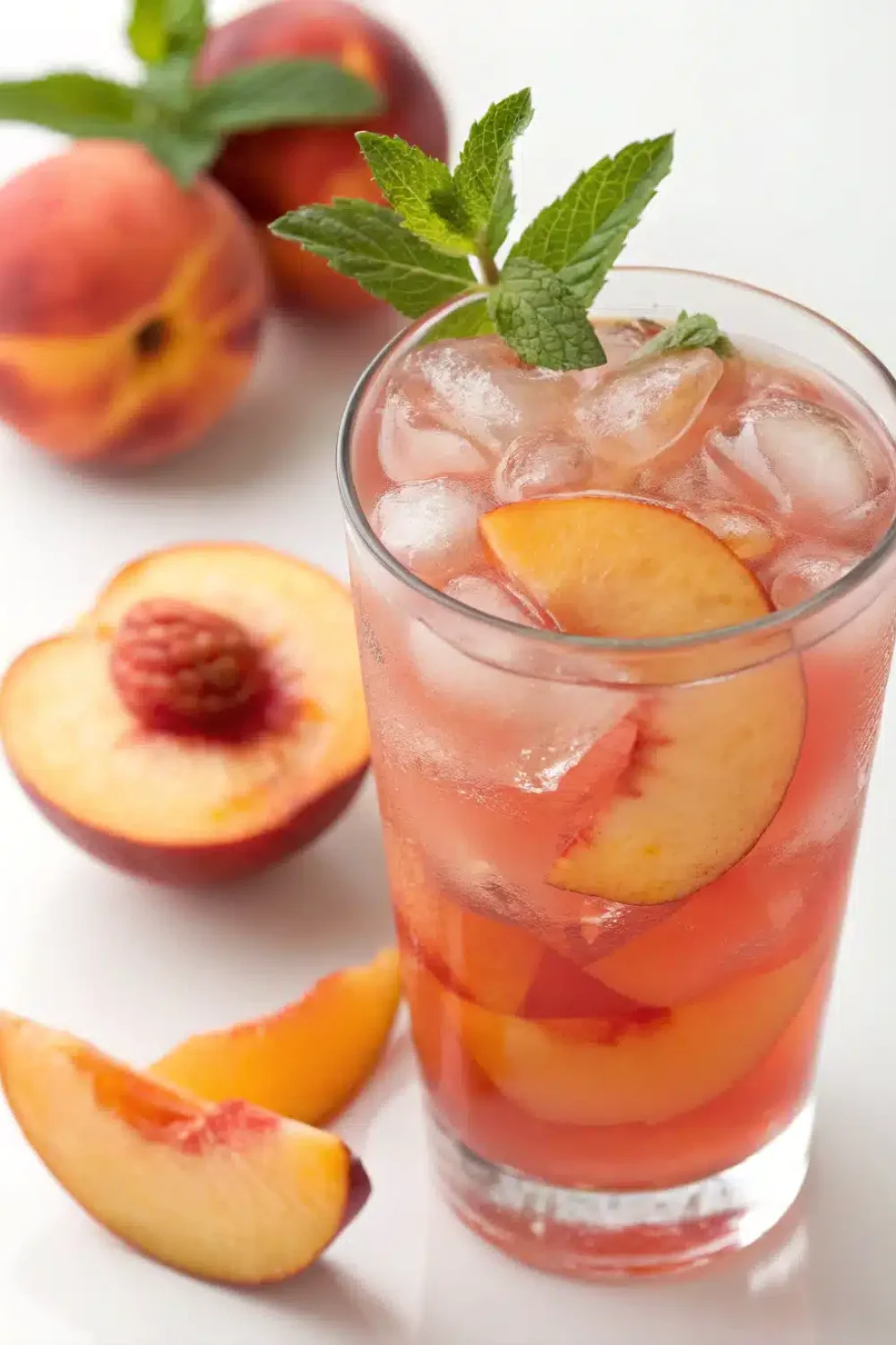 - When ready to serve, pour over ice and garnish with fresh peach slices, lemon wheels, and mint leaves for an impressive presentation.